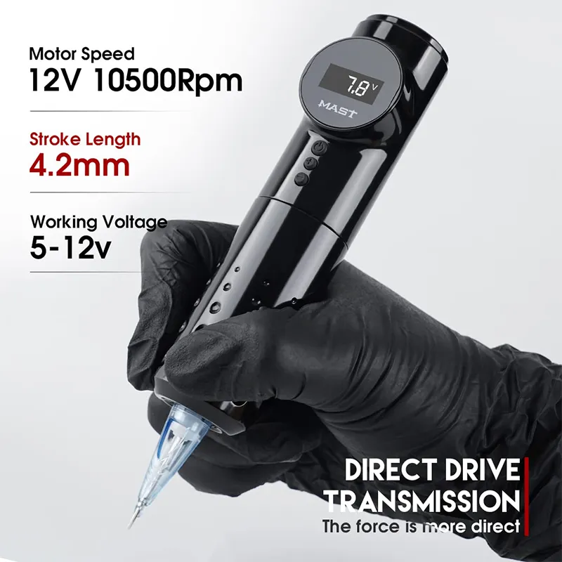 دستگاه قلم خالکوبی دوار بی سیم Mast Archer دارای صفحه نمایش ولتاژ LCD قابل مشاهده است، ولتاژ به راحتی قابل تنظیم است. قاب ساخته شده از آلیاژ آلومینیوم استاندارد و حک شده CNC. وزن: 186 گرم، طول: 132 میلی متر، قطر: 32 میلی متر. مونتاژ با دست، بدنه یک تکه و بدون درز، بدون زحمت برای پوشش و محافظت.