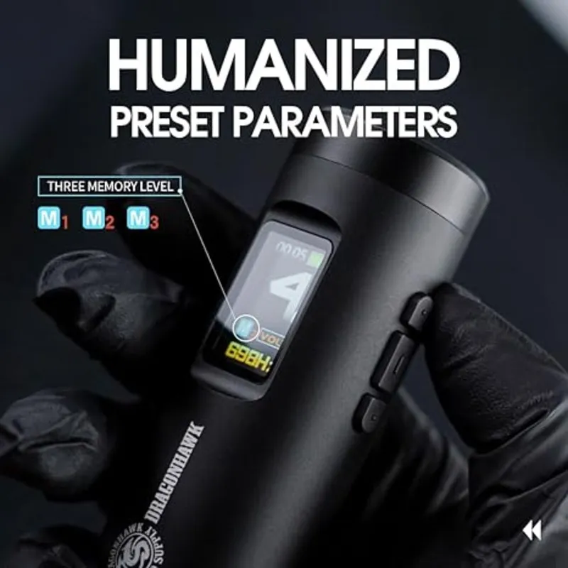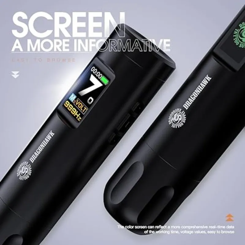 قلم خالکوبی Dragonhawk X7 یک صفحه نمایش هوشمند را برای خواندن آسان تر، کنترل حالت های مختلف نشان می دهد. صفحه نمایش بزرگتر، صفحه نمایش روشن تر.