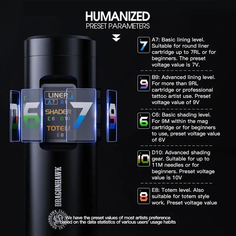 سرعت بالا، سر و صدای کم و پایدار، مصرف انرژی کم اما قدرت بیشتر، بدون گرما برای کار طولانی مدت. 12 ولت / 10500 دور در دقیقه، برای آستر یا سایه زن عالی کار می کند. این دستگاه خالکوبی دارای طول ضربه استاندارد 3.5 میلی متر است، می تواند سوزن کارتریج را با دقت و قدرت فشار دهد، پوشاندن و محافظت بدون زحمت، تغییر کارتریج کارآمد، مناسب برای اکثر سوزن های کارتریج خالکوبی موجود در بازار است.